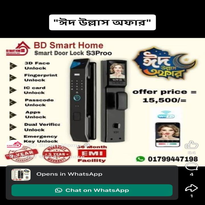 🔎 𝐒𝐦𝐚𝐫𝐭 𝐃𝐨𝐨𝐫 𝐥𝐨𝐜𝐤 𝐒3Pro তে যে সকল 𝐄𝐱𝐜𝐥𝐮𝐬𝐢𝐯𝐞 ফিচারস থাকছে..🔥 ✅Plam Unlock ✅ ভিডিও ইন্টারকম ✅ 3D face আনলক ✅ ফিঙ্গারপ্রিন্ট আনলক ✅ কার্ড আনলক ✅ পাসওয়ার্ড আনলক ✅ ডুয়েল ভেরিফিকেশন ✅ এ্যাপস আনলক ✅ ইমারজেন্সি কী আনলক ✅ পাওয়ার পুট আনলক ২ বছরের রিপ্লেসমেন্ট গ্যারান্টি ৫ বছরের সার্ভিস ওয়ারেন্টি।
